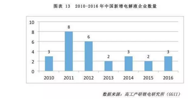 3)2014-2016年,隨著國(guó)內(nèi)新能源汽車(chē)市場(chǎng)的快速發(fā)展,動(dòng)力電池需求快速增長(zhǎng),帶動(dòng)電解液市場(chǎng)獲得較快的發(fā)展,市場(chǎng)上又出現(xiàn)了一批新的進(jìn)入者。