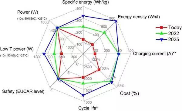圖1現(xiàn)有動(dòng)力電池的技術(shù)指標(biāo)以及未來10年的發(fā)展目標(biāo)