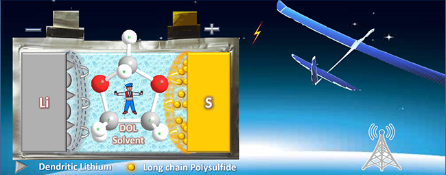 一直以來,科研人員使用硝酸鋰添加劑來解決上述問題,但是硝酸鋰、炭黑、單質(zhì)硫共存的電池體系存在安全隱患。該研究團(tuán)隊(duì)首次設(shè)計出一類不含硝酸鋰的高性能電解液,兼具較低的多硫化鋰溶解度(Ksp)、較高的鋰離子傳導(dǎo)率、較高的單質(zhì)硫利用率和優(yōu)異的金屬鋰界面穩(wěn)定性。采用該電解液組裝的4000 mAh鋰硫電池器件,其比功率可達(dá)60 Wkg-1,比能量可達(dá)350 Whkg-1,且能穩(wěn)定循環(huán)30次以上,此技術(shù)有望使太陽能無人飛機(jī)連續(xù)飛行1個月。該工作為鋰硫電池電解液材料的設(shè)計制備提供了新思路。