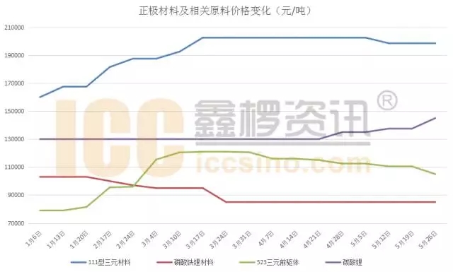 本周三元材料市場(chǎng)較為穩(wěn)定,主流報(bào)價(jià)18萬/噸左右,有部分廠家價(jià)格略有下調(diào)。大型企業(yè)表示銷量很好,在生產(chǎn)方面,基本是滿產(chǎn)生產(chǎn),寧波某企業(yè)表示每月都在擴(kuò)產(chǎn),也有企業(yè)表明準(zhǔn)備在六月份擴(kuò)大生產(chǎn)??梢钥闯觯袌?chǎng)依舊很火,沒有因?yàn)樵牧蟽r(jià)格的變動(dòng)而影響生產(chǎn)。