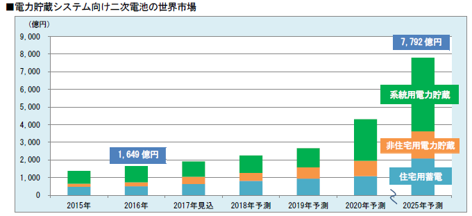 報告顯示,2016年全球儲能電池市場規(guī)模為1649億日元(約合人民幣101.5億元),其中,鋰離子電池隨著價格不斷下降,應(yīng)用領(lǐng)域?qū)⒏訌V泛,并逐漸實現(xiàn)大規(guī)模儲能應(yīng)用。另外,電輔助市場與家用光伏的發(fā)展,以及可再生能源發(fā)電并網(wǎng)規(guī)模攀升也將推動鋰離子儲能電池需求進(jìn)一步增長。