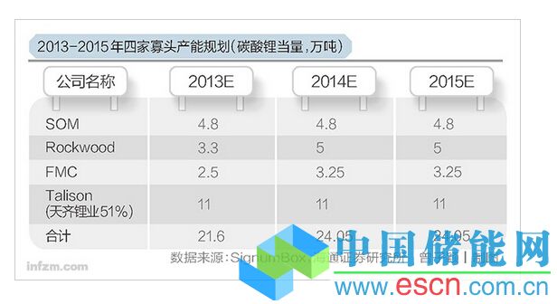 2013-2015 年四家寡頭產(chǎn)能規(guī)劃(碳酸鋰當(dāng)量,萬(wàn)噸) (曾子穎/圖)