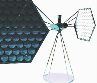 歐洲 太陽帆塔:歐洲在1998年“空間及探索利用的系統(tǒng)概念、結(jié)構(gòu)和技術(shù)研究”計劃中提出了歐洲太陽帆塔的概念。該方案基于美國提出的太陽塔概念,并采用許多新技術(shù)。其中最主要的是采用了可展開的輕型結(jié)構(gòu)——太陽帆。其可以大大降低系統(tǒng)的總重量、減小系統(tǒng)的裝配難度。其中每一塊太陽帆電池陣為一個模塊,尺寸為150米×150米,發(fā)射入軌后自動展開,在低地軌道進行系統(tǒng)組裝,再通過電推力器轉(zhuǎn)移至地球同步軌道。由于該方案采用梯度穩(wěn)定方式實現(xiàn)發(fā)射天線對地球定向,所以太陽帆板無法實現(xiàn)持續(xù)對日定向。