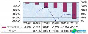 A123系統(tǒng)公司2006年~2011年的凈虧損情況