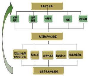 鋰離子電池上游是金屬礦產(chǎn)資源,下游為各種數(shù)碼產(chǎn)品、電動工具以及電動汽車行業(yè)。除此之外,一個(gè)完整的鋰離子電池產(chǎn)業(yè)鏈還應(yīng)包括鋰離子電池的回收利用。
