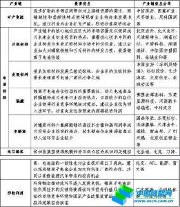 電池材料環(huán)節(jié):正極材料和隔膜以及電解液在整個(gè)鋰離子電池產(chǎn)業(yè)鏈中是最具投資價(jià)值的環(huán)節(jié)。正極材料對提升鋰離子電池性能的重要作用使得其在產(chǎn)業(yè)鏈中處于核心地位,并且巨大的市場容量足以使得其成為未來企業(yè)創(chuàng)業(yè)投資的熱點(diǎn),掌握核心技術(shù)專利的企業(yè)將成為未來正極材料市場中的佼佼者;隔膜由于其影響鋰離子電池的安全性在電池材料中的地位不容忽視,并且目前國內(nèi)的隔膜生產(chǎn)廠商較少,用于動力電池級的高品質(zhì)隔膜基本還依賴進(jìn)口,未來該領(lǐng)域?qū)㈦S著動力汽車電池的發(fā)展而成為行業(yè)的投資熱點(diǎn);電解液中的關(guān)鍵原材料六氟磷酸鋰由于其高技術(shù)含量一直依賴進(jìn)口,其技術(shù)瓶頸和高利潤率使得率先進(jìn)入該領(lǐng)域的企業(yè)能夠享受成長初期由于技術(shù)壁壘帶來的高利潤附加值。