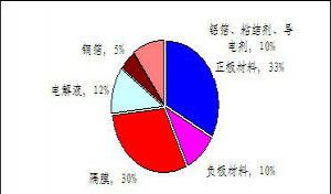 鋰離子電池材料主要包括正極材料、負(fù)極材料、隔離膜、電解液四個(gè)部分,其他還有鋁鉑、銅箔、粘結(jié)劑等。其中正極材料占全部成本的33%左右,負(fù)極材料占比較低,為10%;電解液和隔膜分別占成本的12%和30%左右。