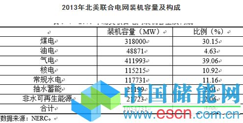 2013年,北美聯(lián)合電網(wǎng)總裝機(jī)容量(指高峰凈裝機(jī),扣除了廠用電,小于銘牌裝機(jī))為10.55億kW,其中,氣電占39.06%,煤電占30.15%,常規(guī)水電占11.16%,核電占10.92%。