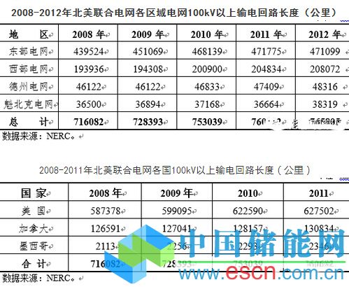 2012年,北美聯(lián)合電網(wǎng)100kV以上的輸電回路長度約76.07萬km,同比增長1.0%。其中,東部互聯(lián)電網(wǎng)線路總長47.11萬km,線路長度減少676km;西部電網(wǎng)線路長度為20.81萬km,新增線路長3238 km;德州電網(wǎng)為4.83萬km,新增線路長度907 km;魁北克電網(wǎng)為3.83萬km,新增線路長度1655km。北美聯(lián)合電網(wǎng)輸電回路中,美國大于100kV的輸電回路長度約為62.75萬km,加拿大為13.08萬km,墨西哥為0.23萬km。