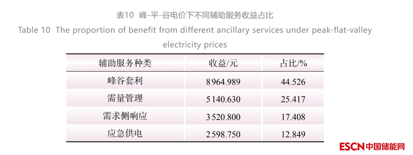 該部分內(nèi)容僅考慮電價政策的變化對儲能經(jīng)濟效益的影響,不改變儲能在容量配置階段的參數(shù)設(shè)定值。在需求響應(yīng)和應(yīng)急供電約束中同樣設(shè)置13:00—15:00為需求響應(yīng)時段、15:00—16:00為保電時段。4種不同輔助服務(wù)的效益對比如表10所示。