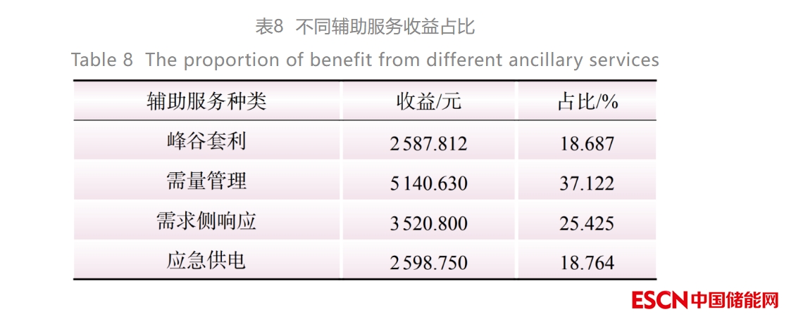 在上述章節(jié)的優(yōu)化配置下,用戶側(cè)儲能8月份不同輔助服務(wù)的收益對比如表8所示。