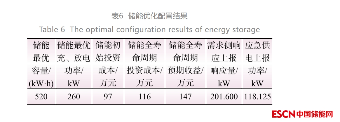本文利用歷史數(shù)據(jù)計算用戶參與輔助服務(wù)所需的儲能配置,儲能系統(tǒng)的日循環(huán)次數(shù)限制在2次。需求響應(yīng)的補助電價為12元/kW,速度系數(shù)為1;應(yīng)急供電補助電價為22元/kW。需求響應(yīng)和應(yīng)急供電年響應(yīng)次數(shù)均為10次。儲能配置最優(yōu)容量和輔助服務(wù)的參數(shù)優(yōu)化結(jié)果如表6所示。