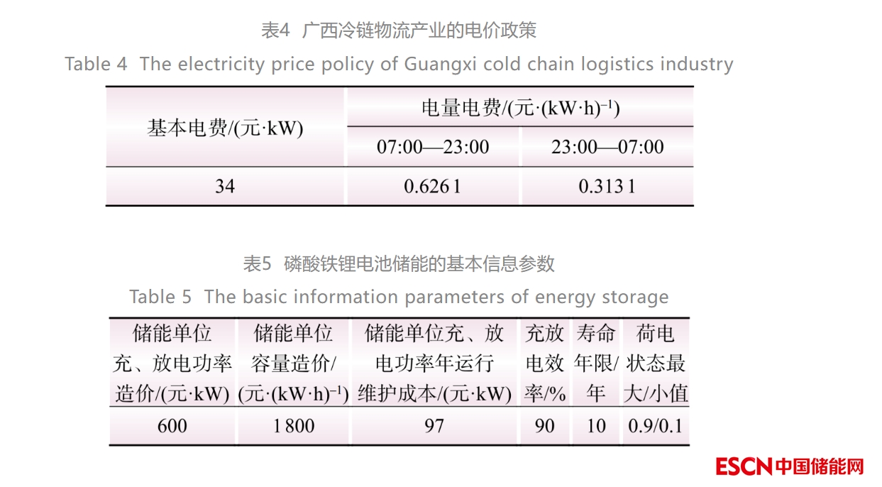 廣西冷鏈物流農(nóng)產(chǎn)品產(chǎn)業(yè)享受電價優(yōu)惠,其分時電價政策[26]如表4所示。儲能系統(tǒng)的基本信息參數(shù)如表5所示。