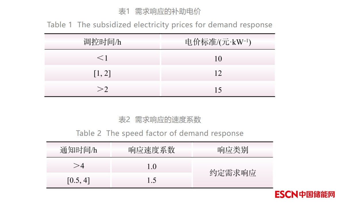 表1為參與響應(yīng)的調(diào)控時間對應(yīng)的補償電價標準。表2為根據(jù)需求響應(yīng)提前通知用戶的時間,給出用戶獲得補償?shù)捻憫?yīng)速度系數(shù)。