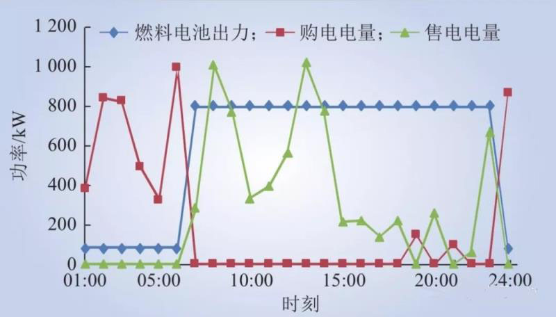 由圖3可知,在1:00~7:00和24:00~1:00間,由于燃料電池的發(fā)電成本高于電價(jià)水平,系統(tǒng)運(yùn)行主要依靠配網(wǎng)的購電,燃料電池在約束條件下以其最小功率運(yùn)行。其余時(shí)段燃料電池均以最大功率運(yùn)行,與儲能單元、光伏電源一同將電供給負(fù)荷,減少微電網(wǎng)向配網(wǎng)的購電量,降低系統(tǒng)的運(yùn)行成本。同時(shí),在滿足內(nèi)部負(fù)荷且有富余電量的情況下,微電網(wǎng)在峰平電價(jià)時(shí)段(圖中的7:00~18:00,20:00~21:00,23:00~24:00)售以配網(wǎng),實(shí)現(xiàn)削谷填峰。