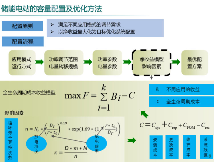 第一個方面是配置,對于它的應用模式這邊來進行原則。第一,滿足不同應用模式的調(diào)節(jié)需求,第二,滿足不同方式的全生命周期成本收益,分析儲能的放電、充電倍率,以及放電深度對儲能壽命的影響,提出儲能在電網(wǎng)中容量配置的優(yōu)化模型。