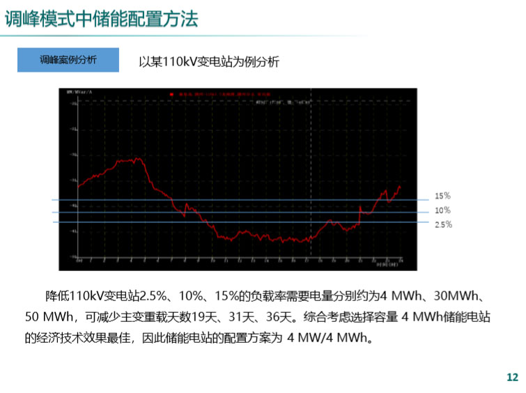 儲能技術(shù)的應用于調(diào)控模式主要是包括功率配置還有容量配置,對于儲能的功率我們一般都采用了儲能電站的最大出力,儲能電站以及連續(xù)電量,以及最大尖峰電量的最大值來做的。舉個例子來說,這是某某變電站的負荷曲線,110主變負載率是屬于重載的模式,這種情況對于主變重載的擴容,第一這個站因為它位置比較特殊,基本沒有線路走廊,通過這樣我們可以建儲能來給它削峰填谷,第一可以延緩它增容的時間,第二在案例分析上面我們可以結(jié)合時間效益和社會效益,如果說我新建儲能我是不用新建一個長距離的線路走廊的,包括費用都是可以做一個相關(guān)的經(jīng)濟比較的。
