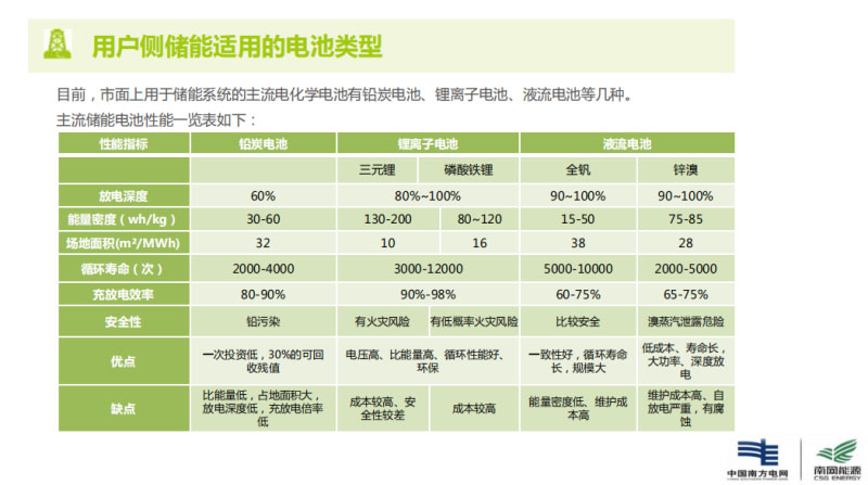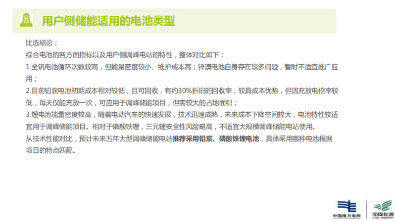 我們對(duì)比起來的結(jié)論是,目前首選的還是鋰離子電池,其次才是鉛炭,但是這也要看基本的經(jīng)濟(jì)性模型,我們的經(jīng)濟(jì)模型影響很大,很多邊界條件都有影響。此外還有一個(gè),以后的梯次電池,因?yàn)榇笠?guī)模的動(dòng)力電池要退役,梯次電池還有很好的應(yīng)用場(chǎng)景,我們目前磷酸鐵鋰、三元都在用,也在做一個(gè)比對(duì)示范項(xiàng)目。