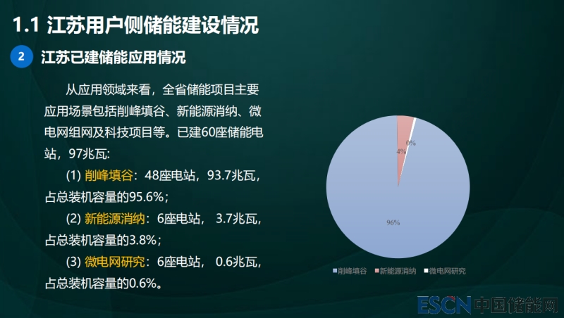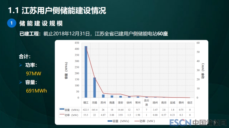 首先講一下江蘇用戶側(cè)儲能情況,我之前說過承擔了兩個國網(wǎng)公司的項目,去年息我一個項目結(jié)束了,就是做用戶側(cè)儲能的控制,主要是讓用戶側(cè)儲能對大電網(wǎng)形成有效支撐,當時主要做調(diào)峰,在局部地區(qū)做了調(diào)頻的實驗嘗試,都是一些示范項目。全省到了97兆瓦的功率,容量是691兆瓦時,不包含江蘇的電網(wǎng)側(cè)儲能,我們還有很大量,不含在這個里面,我們的用戶側(cè)是這樣的。