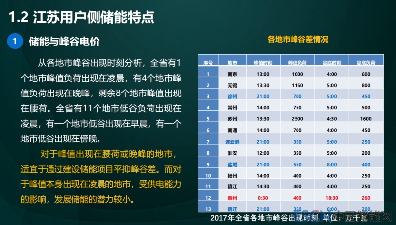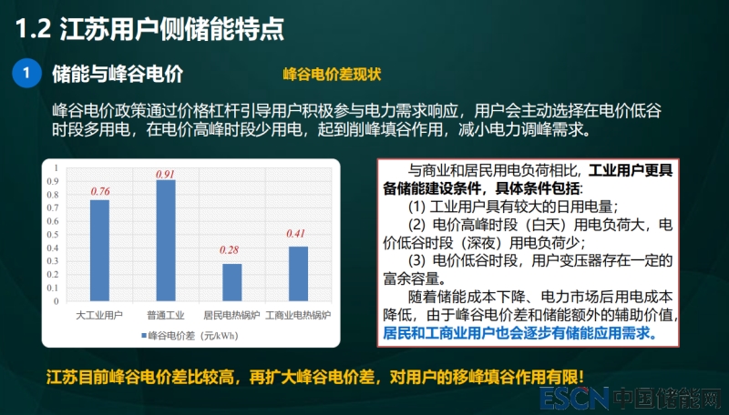 江蘇用戶側(cè)儲能特點,三個部分。儲能峰谷電價,江蘇峰谷電價算是一個條件比較好的地區(qū),我把江蘇峰谷電價的情況說一下。我們物價局《關于創(chuàng)新和完善促進綠色發(fā)展價格機制的實施意見》里面對電價機制做了一些設計,里面包括了完善峰谷電價的機制,鼓勵用戶削峰填谷,這是我們的一個政策導向。還有鼓勵參加電力市場交易主體簽訂峰、谷、平段價格和電量的交易合同。峰谷電價差、輔助服務補償市場化機制也鼓勵,還有鼓勵電動汽車提供儲能服務,這個說了好多年,具體怎么做大家還是比較困惑。因為我們VT2(音譯)技術實驗室已經(jīng)研究出來了,但是在社會上推廣應用,我們看到的都是概念性的,還沒有真正有人把這個東西用很好,也有很多顧慮,認為這個東西對車的傷害和損失比較大,這個也是一個問題。另外一個推行居民的峰谷電價。