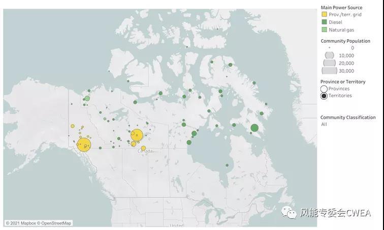 截至 2017 年 5 月加拿大離網(wǎng)社區(qū)分布地圖,按主要電源進行顏色編碼。