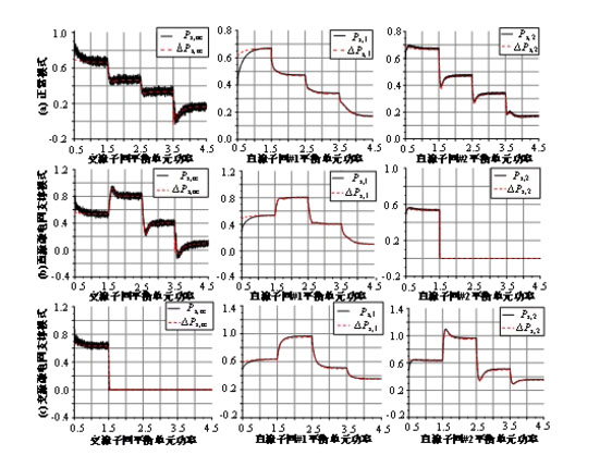本文采用圖1(a)所示的交直流微電網(wǎng)集群結(jié)構(gòu),對本文所提出的控制策略進行仿真驗證并與小信號建模的結(jié)果(黑色曲線為電磁暫態(tài)仿真結(jié)果,紅色為小信號模型仿真結(jié)果)進行比對。本文進行了正常模式運行、直流微電網(wǎng)支撐模式及交流微電網(wǎng)支撐模式三種工況下的仿真測試,并對比了詳細電磁暫態(tài)仿真及利用小信號模型所獲得的仿真結(jié)果(即圖中帶Δ標識的電氣量仿真波形),三種工況下波形如下圖6所示,(a)、(b)、(c)對應(yīng)三種不同模式。從圖中可看出詳細電磁暫態(tài)和小信號模型仿真結(jié)果基本吻合,有效驗證了小信號模型的準確性;此外,通過多種工況仿真測試驗證了本文方法在應(yīng)對正常大功率擾動及運行模式無縫切換等工況下的有效性。