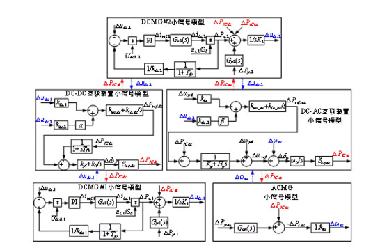大功率波動、運行模式切換等暫態(tài)工況不僅容易對系統(tǒng)內(nèi)直流電壓、交流頻率等造成沖擊,且當(dāng)控制參數(shù)選擇不當(dāng)時,還可能導(dǎo)致系統(tǒng)出現(xiàn)功率振蕩等穩(wěn)定性問題。為此,本文接下來將首先建立交直流微電網(wǎng)集群多運行模式下的小信號穩(wěn)定性分析模型進行穩(wěn)定性分析,為后續(xù)深入研究系統(tǒng)功率振蕩穩(wěn)定機理分析及控制器參數(shù)優(yōu)化設(shè)計提供基礎(chǔ)?;谀K化小信號建模思路,可得交直流微電網(wǎng)集群在正常運行模式下的完整小信號穩(wěn)定性分析模型如下圖所示。