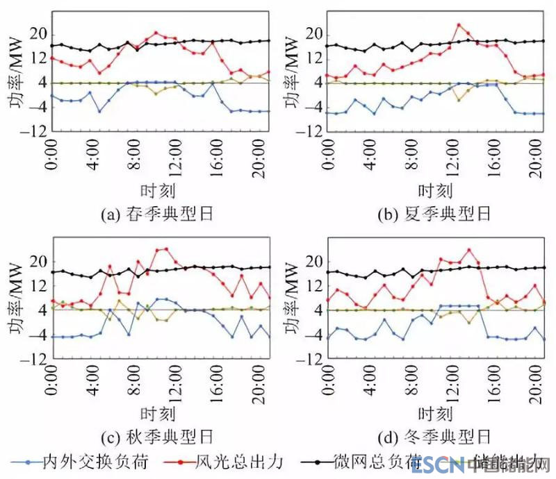 圖9和圖10為傳統(tǒng)運(yùn)營模式和一體化運(yùn)營模式下,春、夏、秋、冬四季典型日微網(wǎng)的運(yùn)行情況(儲(chǔ)能出力負(fù)值表示充電,內(nèi)外交換負(fù)荷負(fù)值表示外。