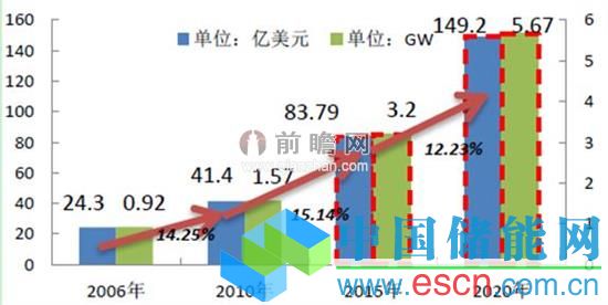 圖表2:2006-2020年全球微電網(wǎng)市場規(guī)模及發(fā)電量預(yù)測(單位:億美元,GW)