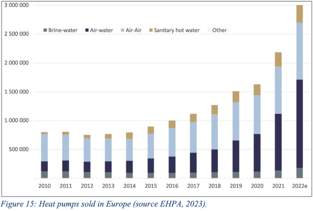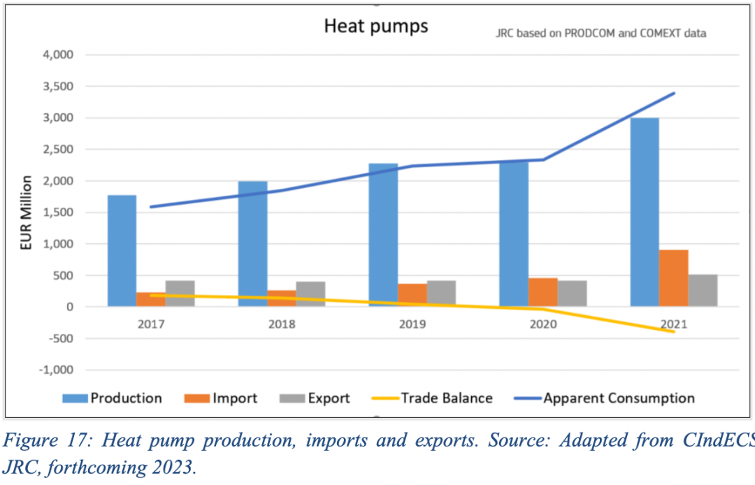 就材料而言,最緊迫的短期瓶頸是半導(dǎo)體,這是全球短缺的一部分。歐盟生產(chǎn)的國(guó)際競(jìng)爭(zhēng)力受到原材料、勞動(dòng)力成本、制造成本、能源成本、稅收等影響,由于歐盟進(jìn)口熱泵仍然相對(duì)較少,我們可以推斷歐盟的生產(chǎn)目前應(yīng)該具有競(jìng)爭(zhēng)力。歐盟進(jìn)口熱泵占?xì)W盟表觀消費(fèi)(生產(chǎn)和凈進(jìn)口)的27%,在歐盟銷售的大多數(shù)熱泵(73%)都是在歐盟制造的,這種情況可能會(huì)繼續(xù)下去。2019-2021年期間,歐盟熱泵在歐盟以外的出口占世界出口的37%。