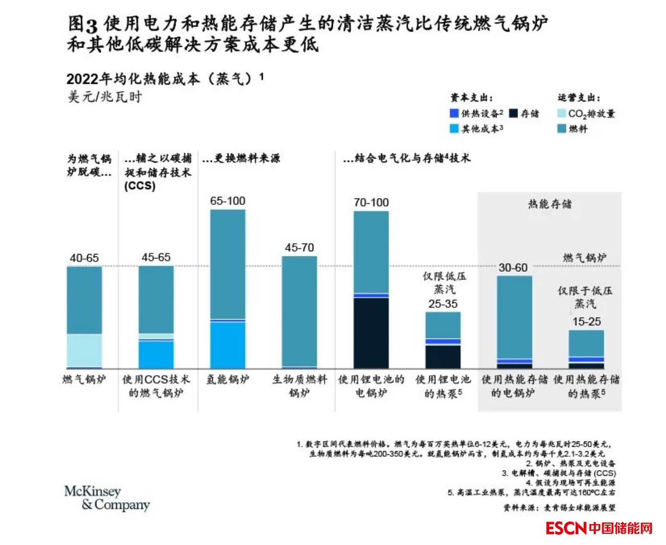 儲熱有助于實現(xiàn)經濟高效的清潔熱能供應?!秲袅銦崮軋蟾妗凤@示,根據2022年長時儲能理事會的成本對標結果,對于工業(yè)過程中最常見的蒸汽或熱空氣這兩種熱能形式,儲熱已經可以提供具有成本競爭力的電氣化與脫碳解決方案。如圖3所示,在燃氣鍋爐脫碳的應用中,相比燃氣鍋爐疊加碳捕捉與存儲技術、氫能鍋爐、生物質鍋爐、結合鋰電儲能的電鍋爐或熱泵等脫碳選項,結合了儲熱系統(tǒng)的電鍋爐或熱泵更具經濟性。