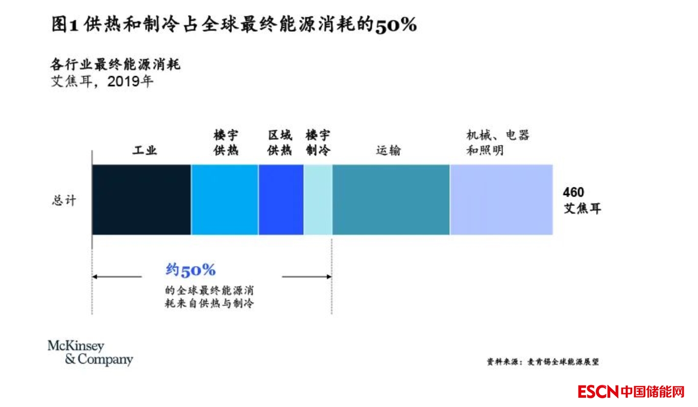 隨著全球能源系統(tǒng)脫碳的不斷推進,人們的視線也逐漸轉移到最重要也最難脫碳的介質之一——熱能。熱能主要應用于工業(yè)生產、樓宇供熱/制冷和區(qū)域供暖,在全球終端能源消耗中的占比已超過50%(見圖1)。由于目前大多數熱能的來源仍是化石燃料,供熱與制冷占到了全球能源相關碳排放【1】的45%,加速熱能脫碳對實現(xiàn)凈零排放至關重要。