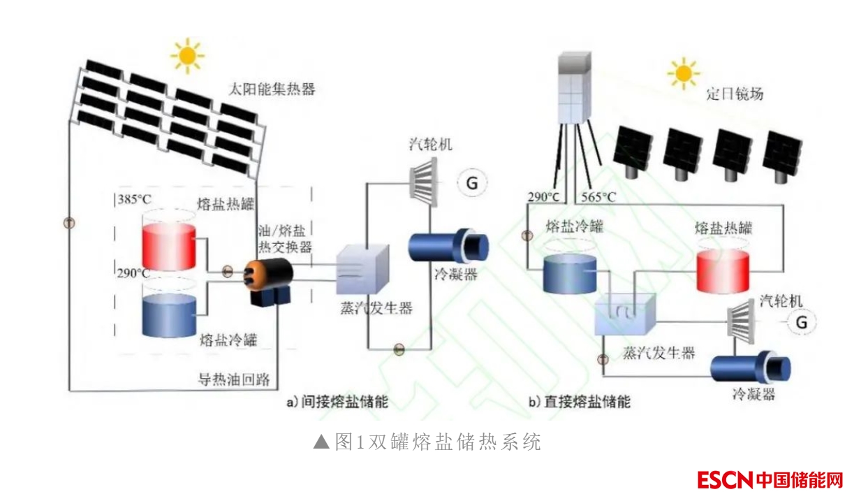 光熱與熔鹽耦合的2種形式在工程中均有應(yīng)用。熔鹽間接蓄熱一般能保持較高的循環(huán)效率,比蒸汽蓄能成本更低,如西班牙Andasol槽式光熱電站是第一個(gè)大規(guī)模熔鹽間接蓄熱電站,容量約為1000MWh,儲(chǔ)能時(shí)間為7.5h。熔鹽直接蓄熱簡(jiǎn)化了電站設(shè)備組成,后期運(yùn)維便捷。典型的熔鹽直接蓄熱電站是美國(guó)Solar two項(xiàng)目,該項(xiàng)目使用的硝酸鹽混合鹽被稱作Solar鹽,溫度范圍290~565℃。此后的塔式熔鹽光熱電站多沿用直接蓄熱方式與此工作溫度區(qū)間,如西班牙Gemasolar電廠、青海中控德令哈10MW項(xiàng)目。