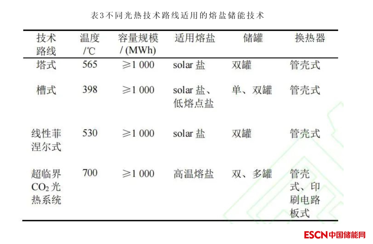 光熱發(fā)電中,塔式通過吸熱塔吸收聚集的太陽能,傳熱至熱罐;槽式通過集熱管收集太陽能;線性菲涅爾式光熱發(fā)電成本低,在我國(guó)西部擁有良好的商業(yè)化前景;超臨界CO2用于光熱系統(tǒng)具有循環(huán)效率高、結(jié)構(gòu)緊湊的優(yōu)勢(shì)。光熱發(fā)電加熱器一般為低壓電阻式,以較低的成本滿足需求。除加熱器外,不同技術(shù)路線涉及的熔鹽儲(chǔ)能技術(shù)存在的區(qū)別見表3