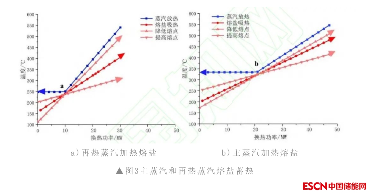 由圖3a)可見,由于點(diǎn)a處夾點(diǎn)溫度的存在,熔鹽被加熱的溫度受到熔鹽最低使用溫度和夾點(diǎn)溫度的限制,其使用溫度范圍有限。常見的低熔點(diǎn)熔鹽使用溫度范圍為140~450℃,受到夾點(diǎn)溫度影響,其最高溫度僅能被加熱至400℃左右。若降低熔點(diǎn),選擇熔點(diǎn)在100℃左右的熔鹽,其使用溫度上限就可以提升至450℃,但此類熔鹽的應(yīng)用研究尚不充分,工程實(shí)際中使用較少。若采用常規(guī)Solar鹽,其使用溫度為260~565℃,此時(shí)熔鹽最低工作溫度已經(jīng)接近飽和蒸汽線,被再熱蒸汽加熱的空間較小,并不適用于該場(chǎng)景。綜上所述,在再熱蒸汽蓄熱的情景下,宜采用熔點(diǎn)較低的熔鹽,其最高使用溫度無需設(shè)置過高。
