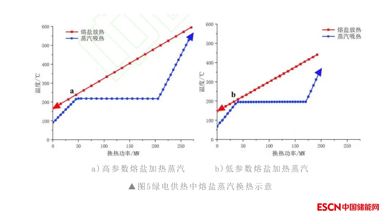 在綠電供熱場(chǎng)景中,由熔鹽加熱蒸汽或過冷水,應(yīng)根據(jù)不同的情況選擇低參數(shù)或高參數(shù)熔鹽。綠電供熱中熔鹽蒸汽換熱情況如圖5所示。由圖5a)可見,蒸汽的升溫受到夾點(diǎn)a的限制,若要輸出超過500℃的高溫工業(yè)蒸汽,就需要提高熔鹽的蓄熱溫度至約600℃,選用高參數(shù)熔鹽與蒸汽進(jìn)行換熱。在供應(yīng)中低溫工業(yè)蒸汽時(shí),使用熔點(diǎn)較低的硝酸鹽熔鹽即能滿足需求(圖5b)。熔鹽加熱蒸汽的過程受夾點(diǎn)b溫度限制,最終在低參數(shù)熔鹽工作區(qū)間150~450℃,可供應(yīng)1.2 MPa、370℃的蒸汽。