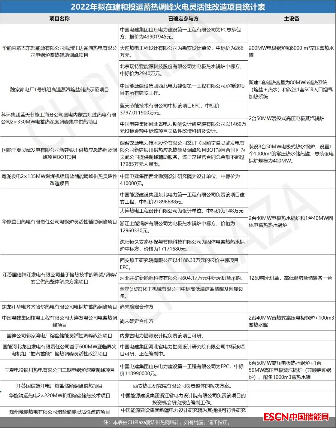 蓄熱調(diào)峰技術(shù)方案作為其中的一種主要技術(shù)路線,對于提高電力系統(tǒng)的可再生能源消納能力和防治大氣污染具有十分重要的意義。CHPlaza清潔供熱平臺統(tǒng)計了2022年在建/投運的蓄熱調(diào)峰火電靈活性改造相關(guān)項目如下,以供參考。