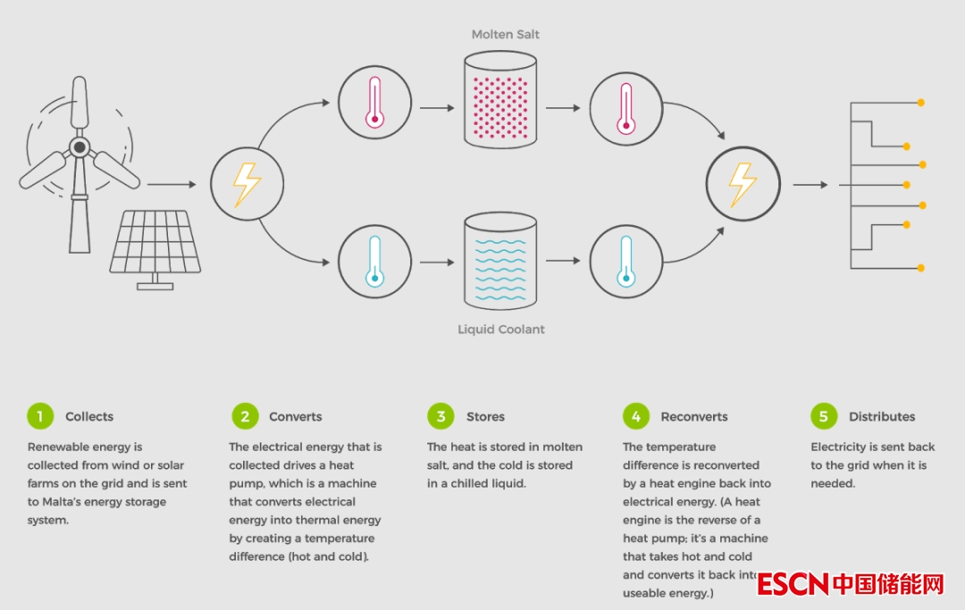 和國內(nèi)主流的熔鹽儲(chǔ)能技術(shù)不同的是,Malta在系統(tǒng)中采用了高溫?zé)岜?。如上圖所示,可再生能源的廉價(jià)電能進(jìn)入儲(chǔ)能系統(tǒng),通過一種高溫?zé)岜脤㈦娔苻D(zhuǎn)化為冷能和熱能兩種形式,熱能存儲(chǔ)于熔鹽中,冷能存儲(chǔ)于一種冷凍液中,在需要之時(shí),冷熱能可通過一種熱機(jī)再次轉(zhuǎn)為電能,返回電網(wǎng),也可將熱能和冷能直接供應(yīng)給能源用戶。