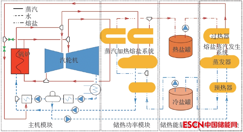 ▲嵌入高溫熔鹽儲(chǔ)熱系統(tǒng)的火電機(jī)組工藝圖