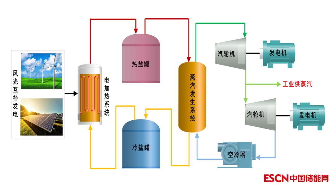 該項(xiàng)目可利用西部地區(qū)的風(fēng)電、光伏等可再生能源電力或廉價谷電,通過熔鹽電加熱系統(tǒng)加熱熔鹽,實(shí)現(xiàn)儲能,存儲的熱量可通過蒸汽發(fā)生系統(tǒng)產(chǎn)生蒸汽,推動汽輪發(fā)電機(jī)再次輸出持續(xù)、穩(wěn)定的電能,同時輸出工業(yè)蒸汽。