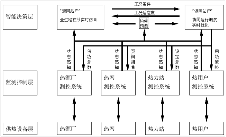 其運行的基本邏輯是,監(jiān)測控制層采用SCADA或DCS系統(tǒng)對供熱設(shè)備層的熱源、熱網(wǎng)、換熱站、二級網(wǎng)、建筑物等狀態(tài)數(shù)據(jù)(溫度、壓力、流量、開度、熱量等)進行感知和測量,以用于反映系統(tǒng)運行狀態(tài)或作為系統(tǒng)的調(diào)控參數(shù)。