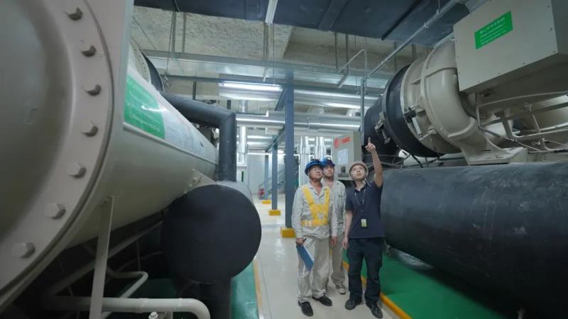 電網(wǎng)員工與客戶在中央空調(diào)機(jī)房進(jìn)行查勘
