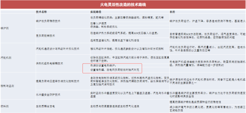 提高火電的深度調(diào)峰能力主要包括三個路徑:提高鍋爐側(cè)鍋爐低負(fù)荷穩(wěn)燃能力;實(shí)現(xiàn)汽輪機(jī)側(cè)機(jī)組供熱工況熱電解耦;提高機(jī)組主輔機(jī)及其環(huán)保裝置在低負(fù)荷下的設(shè)備適應(yīng)性。由此也產(chǎn)生了多種技術(shù)路線。