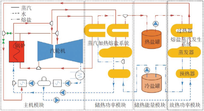 除了工業(yè)蒸汽市場,熔鹽儲能的另一個重要市場為火電靈活性改造,其原理為在火電機組熱力系統(tǒng)中的“鍋爐汽機”之間,嵌入大容量高溫熔鹽儲熱系統(tǒng),削弱原本剛性聯(lián)系的“爐機耦合”,深度調(diào)峰時,保持鍋爐正常運行負荷,汽機運行在低負荷調(diào)峰工況,鍋爐側(cè)多余高參數(shù)蒸汽熱量被儲熱系統(tǒng)存儲,保證大規(guī)模儲熱和深度調(diào)峰運行。