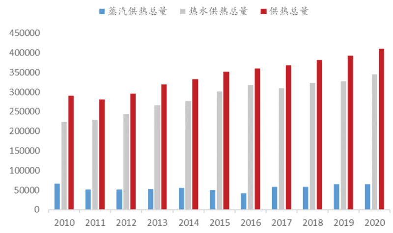 據(jù)國家統(tǒng)計局數(shù)據(jù),2020年,我國城市供熱總量為410058萬吉焦,連年呈持續(xù)上升趨勢,其中,蒸汽供熱量為65054萬吉焦,熱水供熱量345004萬吉焦。