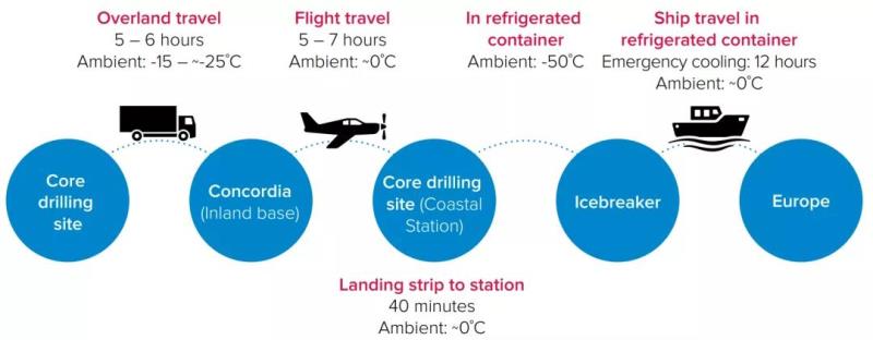 為了研究氣候變化,將通過一種創(chuàng)新的零碳制冷技術使從南極冰中鉆取的冰柱在運往歐洲實驗室的途中保持冷凍狀態(tài)。英國南極調查局(BAS)的研究包括鉆探、包裝、轉移、儲存從格陵蘭島和南極洲開采的冰芯,并將其運輸至英國進行分析(圖3)。