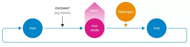 通過化學反應儲存熱量:可以通過可逆化學反應儲存熱能。例如,可以運輸能量密度與化石燃料差不多的金屬鐵,然后用空氣或水等介質氧化以產生熱量,提供潛在的高能量密度低成本解決方案[48]。在將鐵進行氧化用于工業(yè)用途后,還可使用氫氣再次生成鐵,實現(xiàn)潛在的無碳循環(huán)(圖1)[49]。