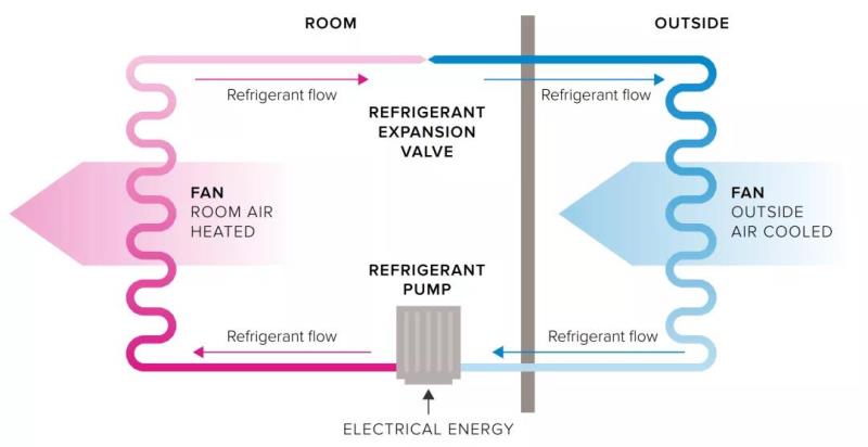 圖1. 空氣源熱泵示意圖:用制冷液將熱量從建筑外部傳遞到內部