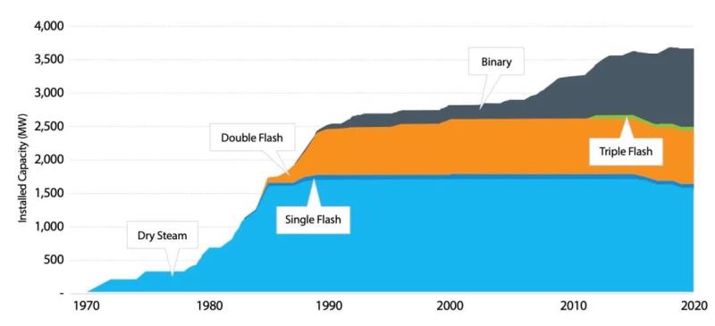 目前美國共有93個地熱發(fā)電站,總裝機容量為3673MW。近年來,美國地熱發(fā)電裝機量增長緩慢,根據(jù)統(tǒng)計,從2015年至2019年期間,美國新增了7個地熱發(fā)電站,總裝機容量186MW,但同期11個地熱電站退役,總裝機容量103MW。