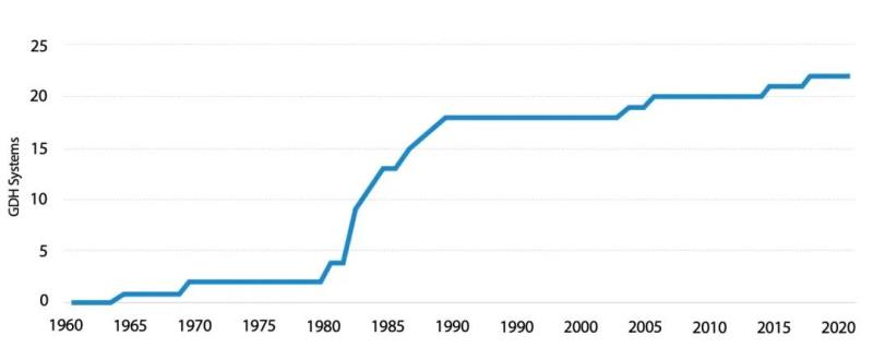 在美國,地熱區(qū)域供暖項目最初是在高品位水熱型地熱資源附近開發(fā)的,但該技術(shù)正在向中-低品位水熱型地熱資源地區(qū)擴展。目前,美國共有23個地熱區(qū)域供熱系統(tǒng),總?cè)萘砍^75MWth。